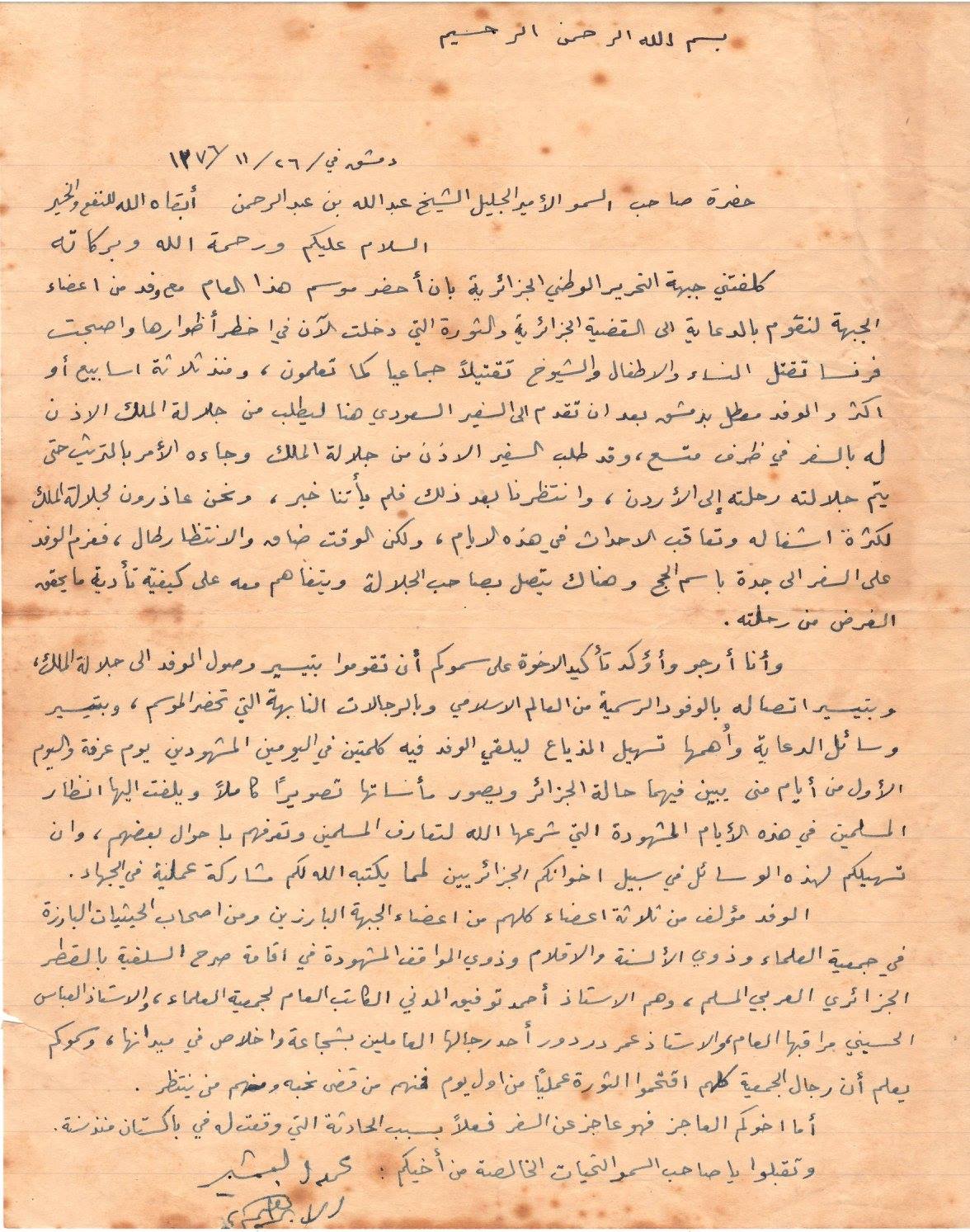 وأنا أرجو وأؤكد تأكيد الأخوة على سموكم أن تقوموا بتيسير وصول الموفد الى جلالة الملك، وبتيسير اتصاله بالوفود الرسمية من العالم الاسلامي وبالرجالات النابهة التي تحضر الموسم ، وبتيسير وسائل الدعاية وأهمها تسهيل المذياع ليلقي الوفد فيه كلمتين في اليومين المشهودين يوم عرفة واليوم الأول من أيام منى يبين فيهما حالة الجزائر ويصور مأساتها تصويراً كاملاً ويلفت إليها انظار المسلمين في هذه الأيام المشهودة التي شرعها الله لتعارف المسلمين وتعرفهم بأحوال بعضهم ، وان تسهيلكم لهذه الوسائل في سبيل اخوانكم الجزائريين لما يكتبه الله لكم مشاركة عملية في الجهاد .