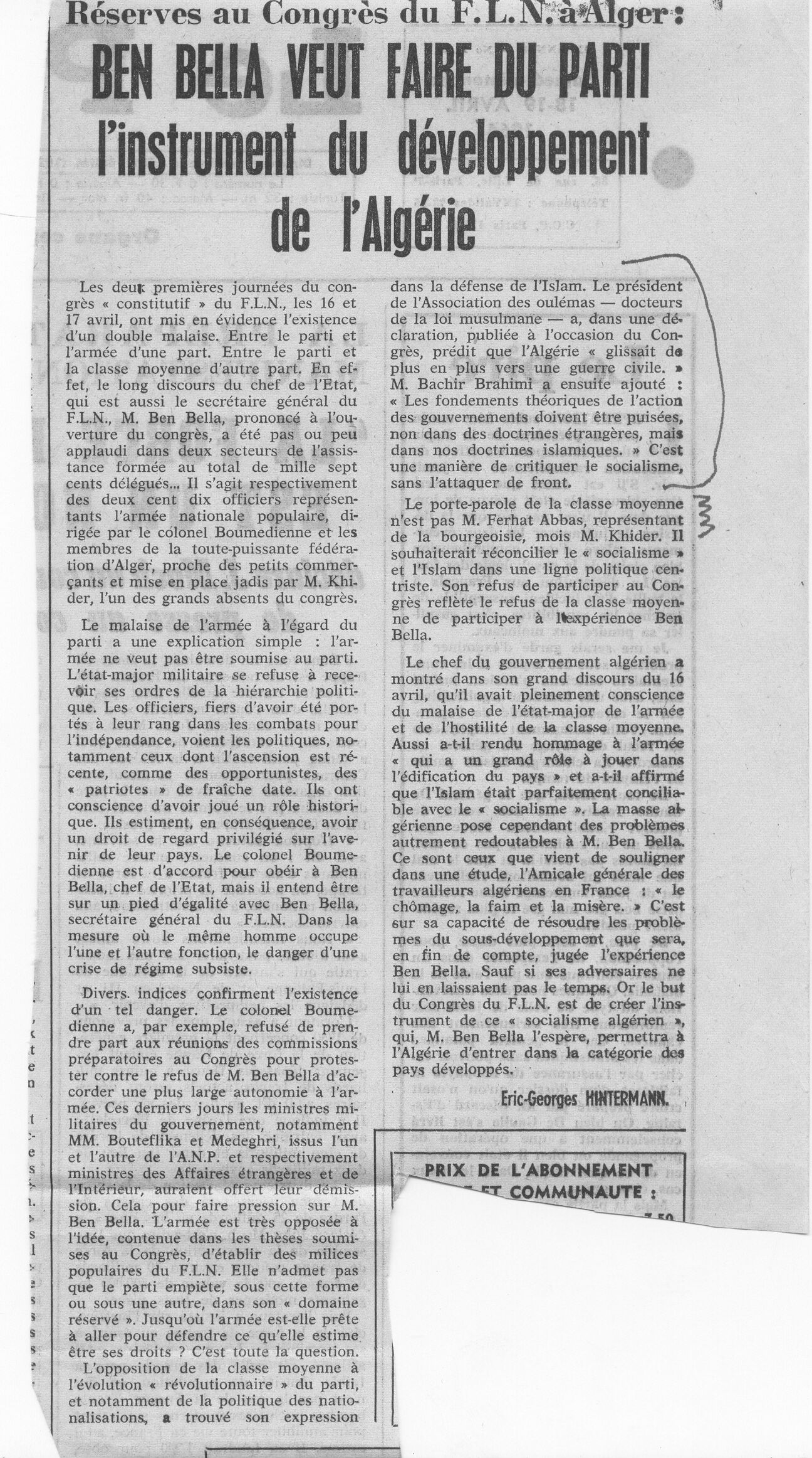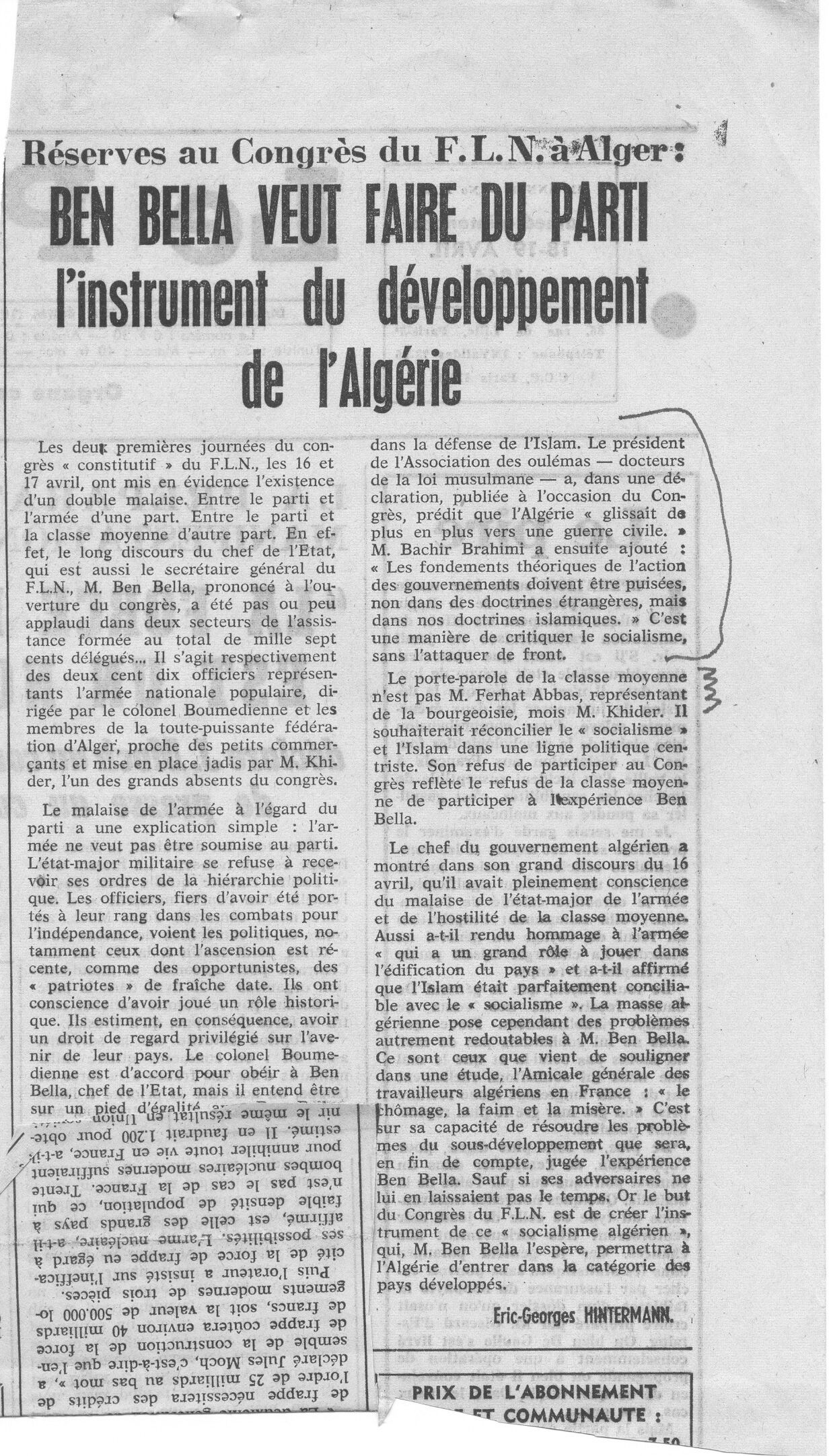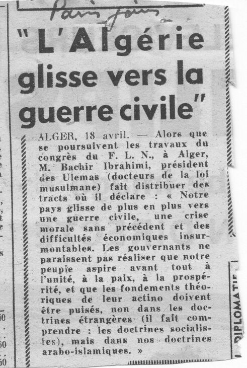 Le 16 avril 1964, alors que se tenait le Congrès du FLN, cheikh El-Ibrahimi publia dans les journaux une déclaration par laquelle il mettait en garde ceux qui détenaient le pouvoir contre les dérives graves de leur politique qui faisaient, à ses dires, glisser l’Algérie vers la guerre civile.