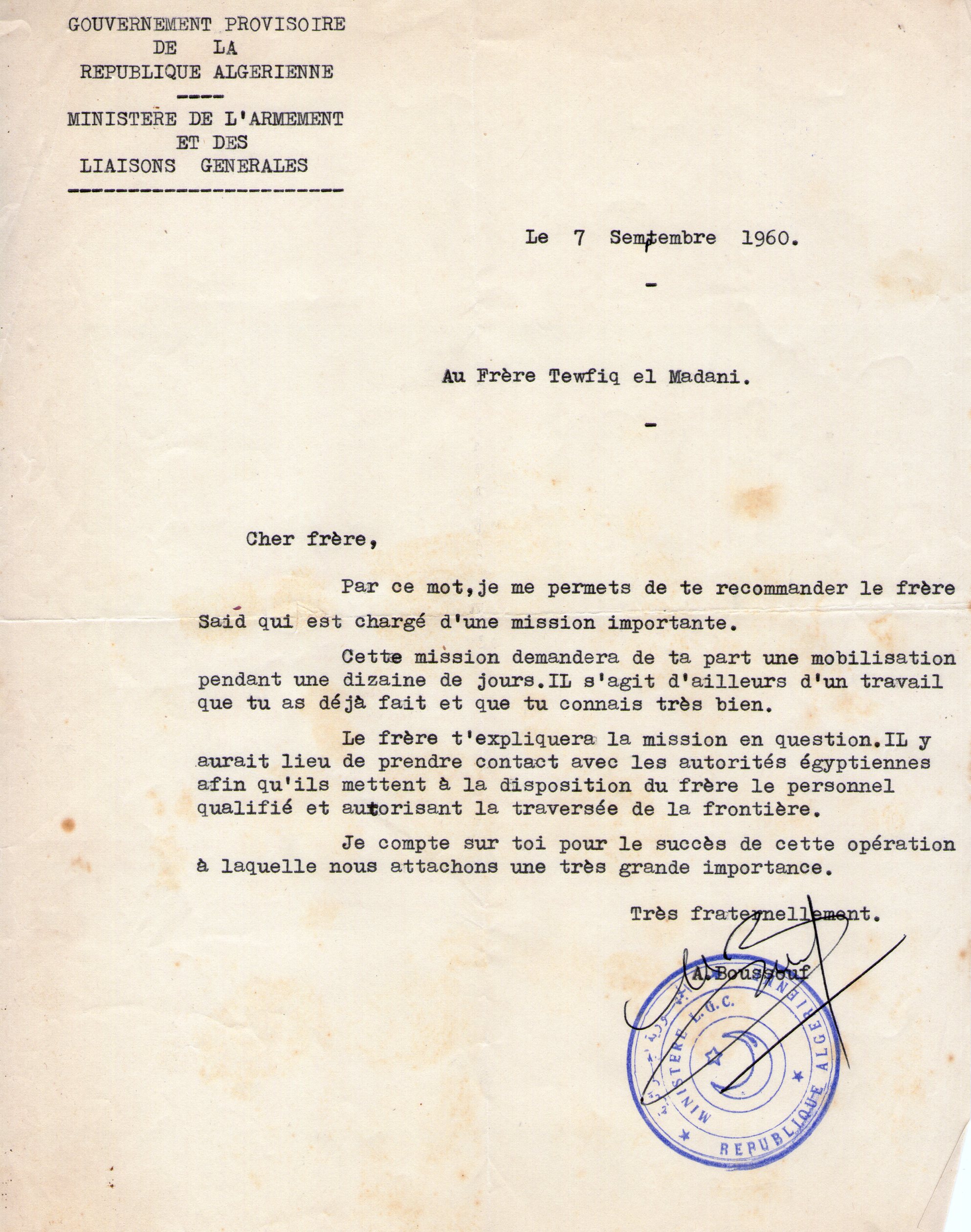 La lettre est datée de 7 septembre 1960. Elle ne renseigne pas sur la nature de la mission.